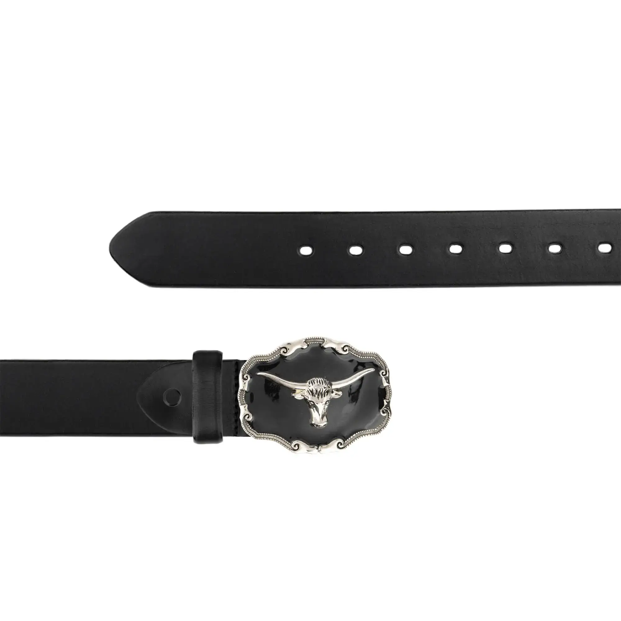 This bold black leather belt is crafted from full grain leather and fitted with a high-contrast Western buckle. The buckle features a glossy black enamel base and a prominent silver longhorn centerpiece, creating a powerful visual statement. Its 1 1/2″ width is ideal for jeans, cowboy boots, and rugged apparel. The belt’s solid leather construction gives it substantial weight and longevity, perfect for everyday use or Western-themed events.