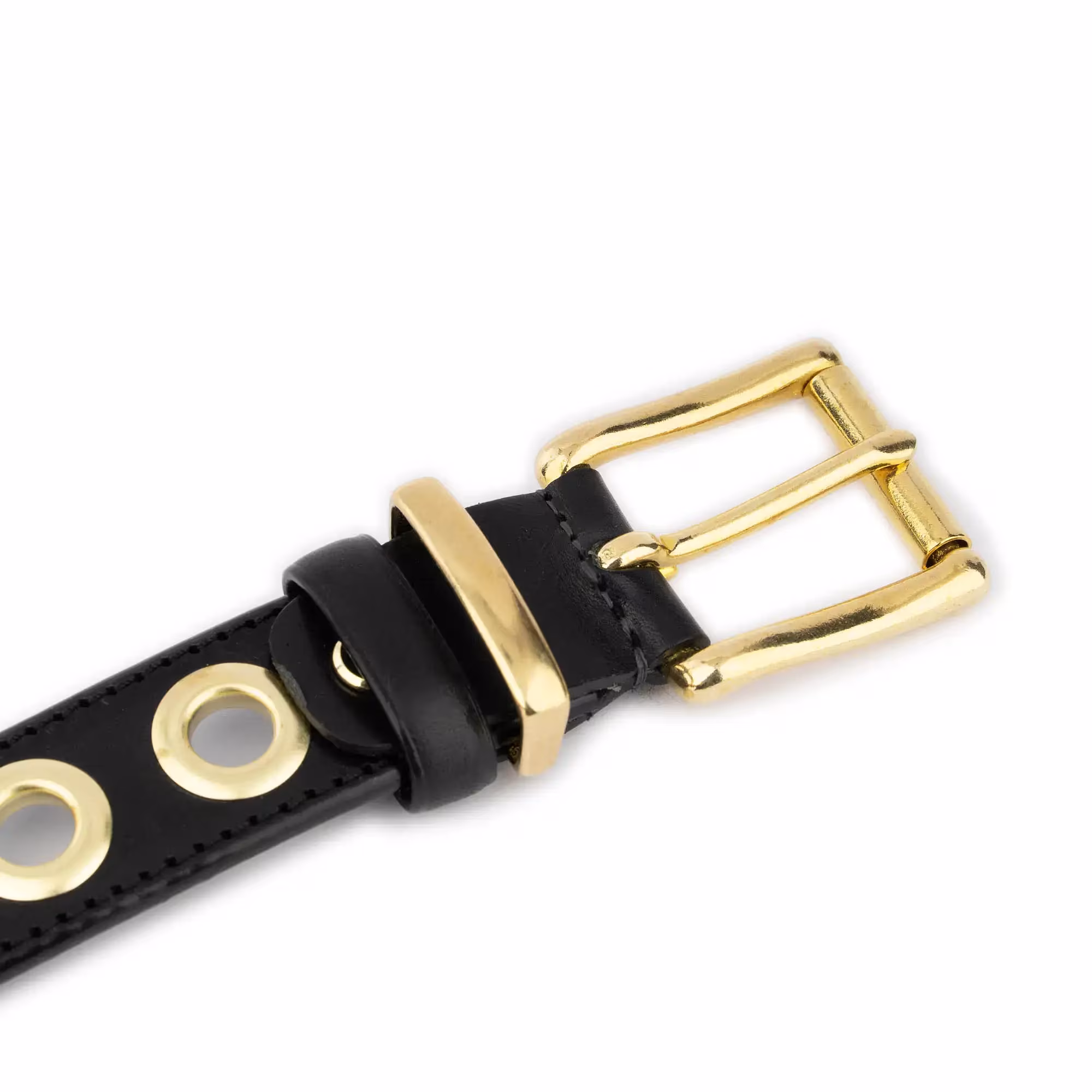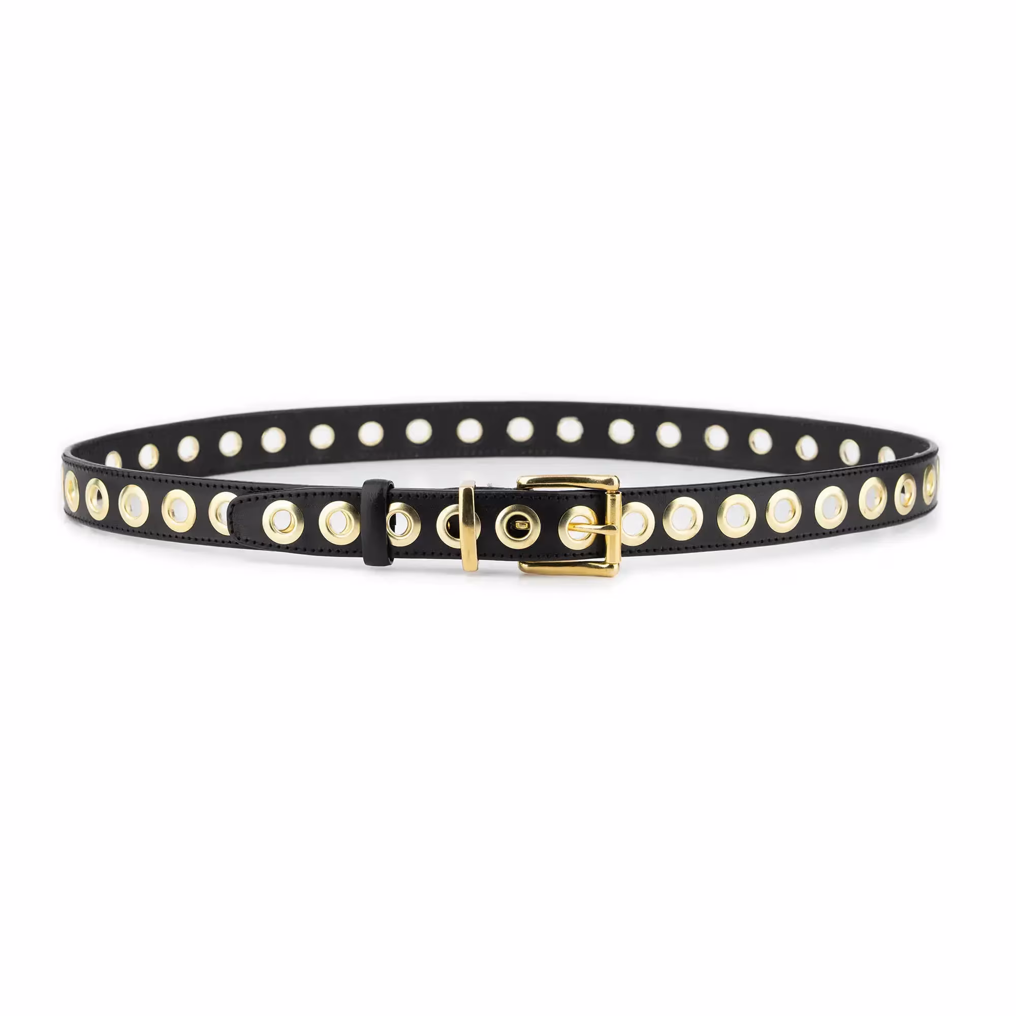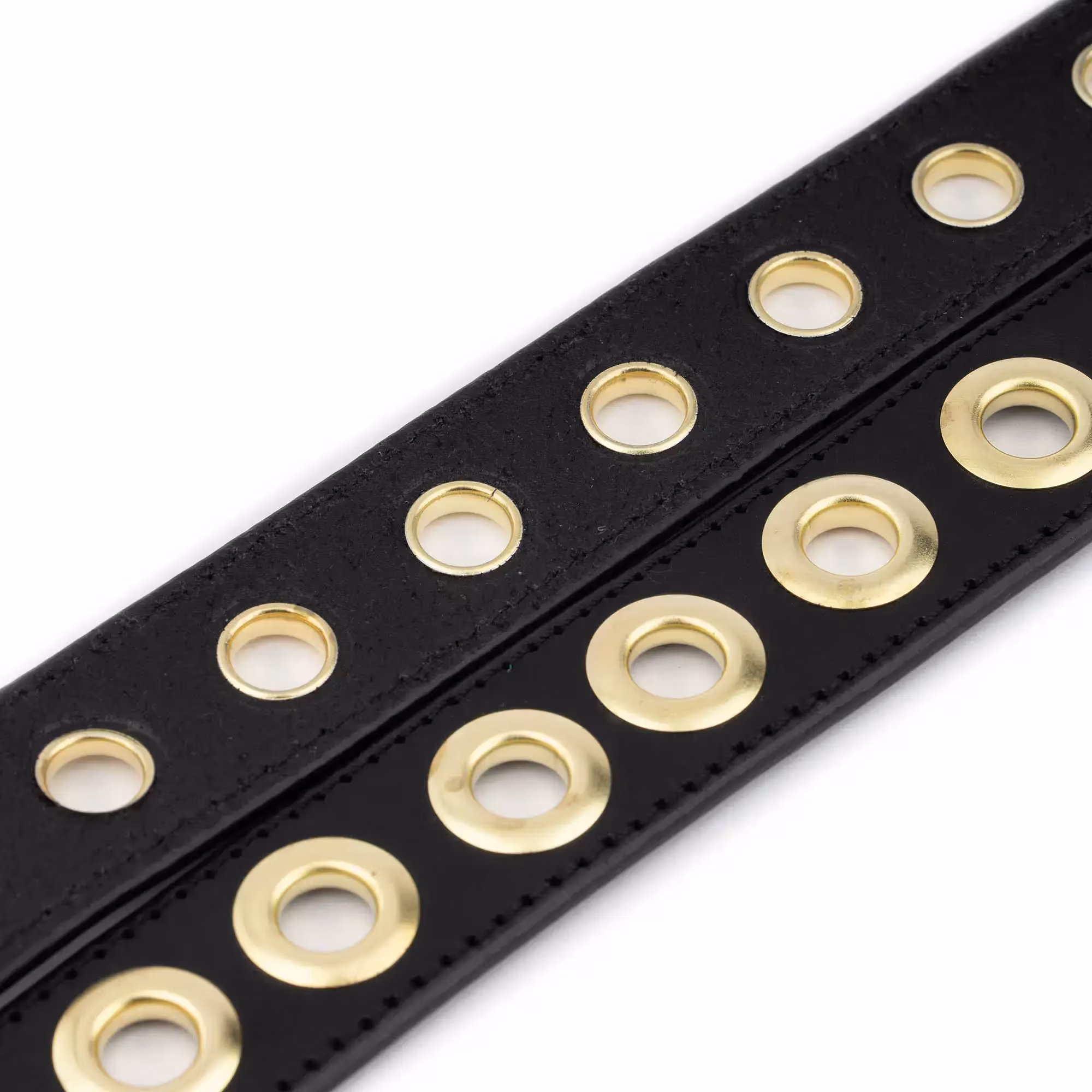 Black Leather Grommet Belt with Gold Eyelets — Turn heads with this bold and stylish accessory, crafted from premium full grain leather. Measuring 1 1/8 inches (3.0 cm) wide, this belt delivers lasting durability with clean double-stitched edges and a structured profile. Shiny gold eyelets and grommets run the entire length, creating a striking, rebellious look while allowing for a fully adjustable fit that flatters all waistlines.