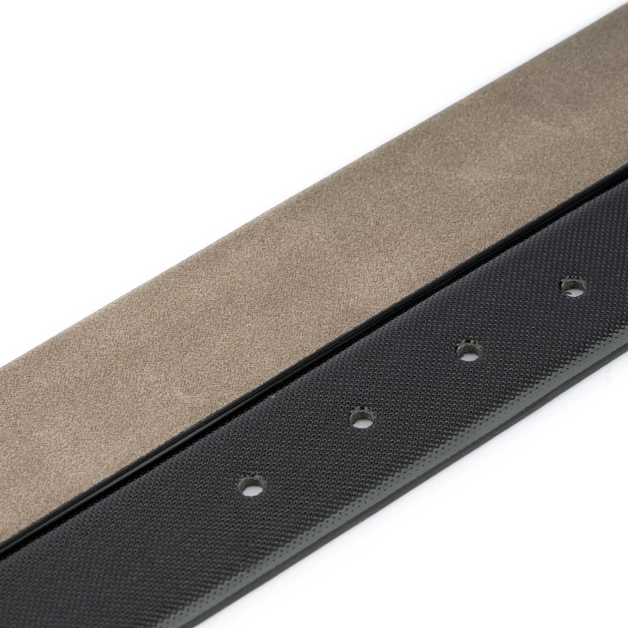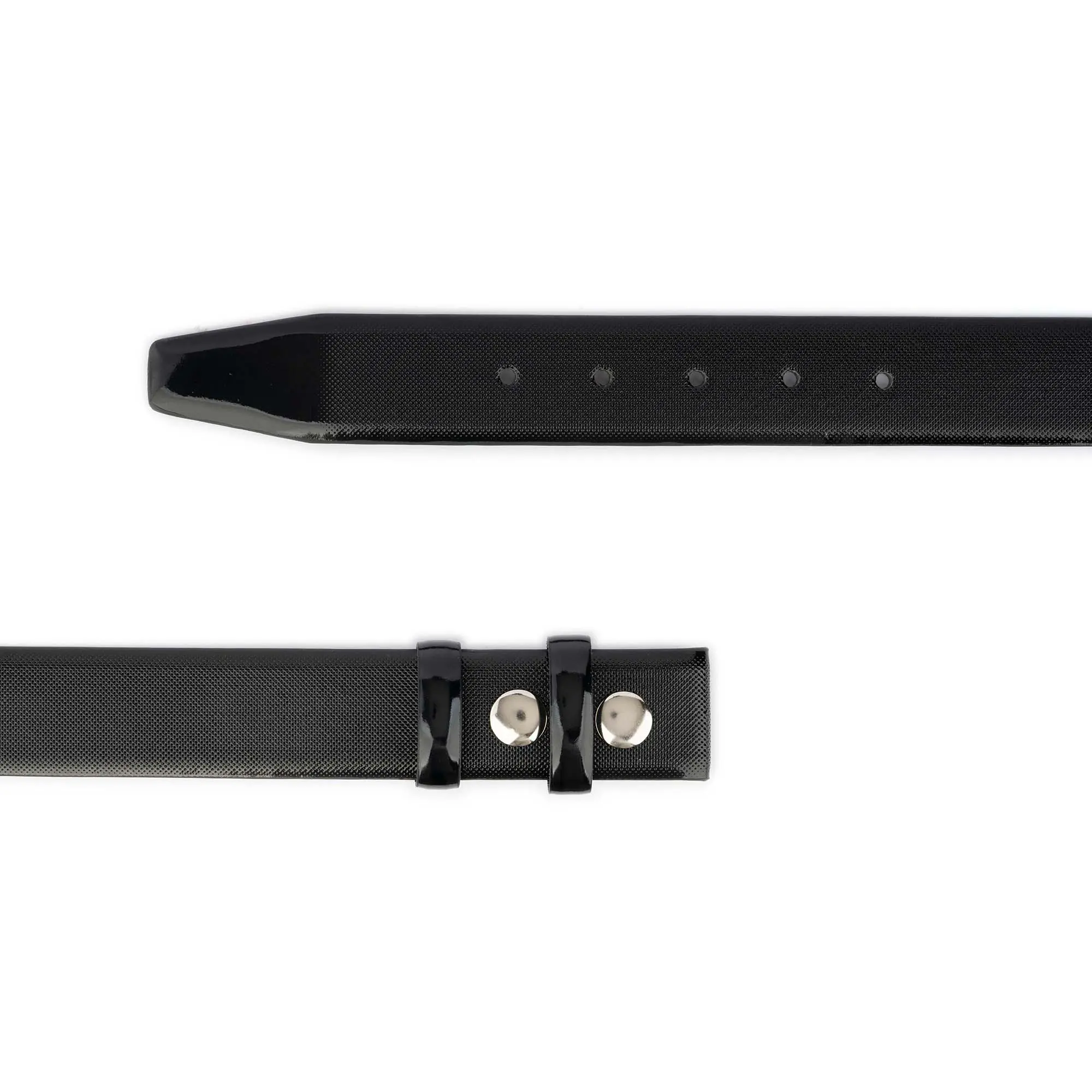 Buy Black Patent Snap Belt Perforated Vegan Leather at LeatherBeltsOnline.com – 1 3/8″ (3.5 cm) wide – Black color – Vegan leather – No buckle – Model code SNAP-35-BLACK-KASV
