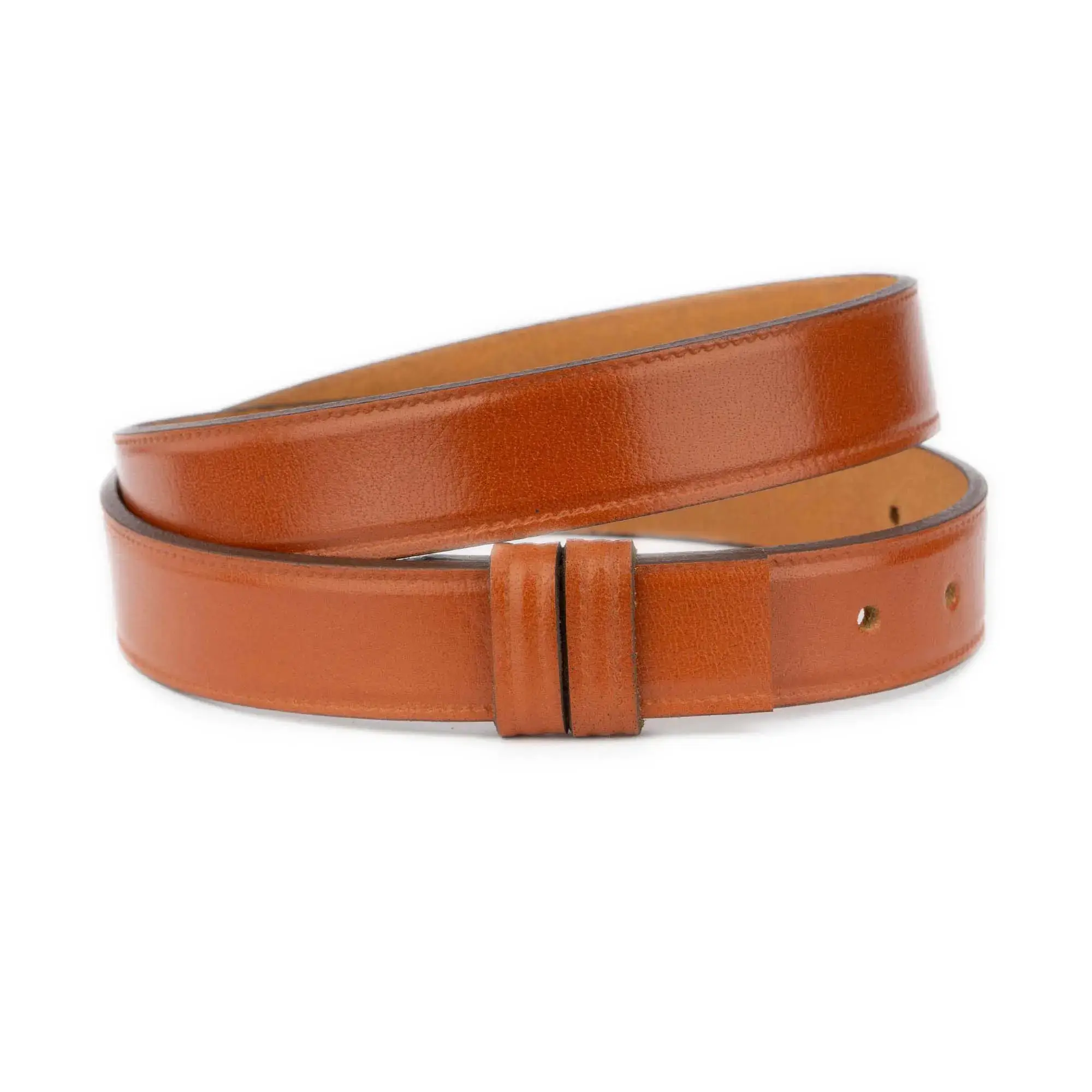 Buy Buffalo Leather Belt Strap Replacement Cognac Brown at LeatherBeltsOnline.com – 1 1/8″ (3.0 cm) wide – Cognac Brown color – Genuine leather – No buckle – Without hole – Model code COGN-30-STIT-CUT-DEREN