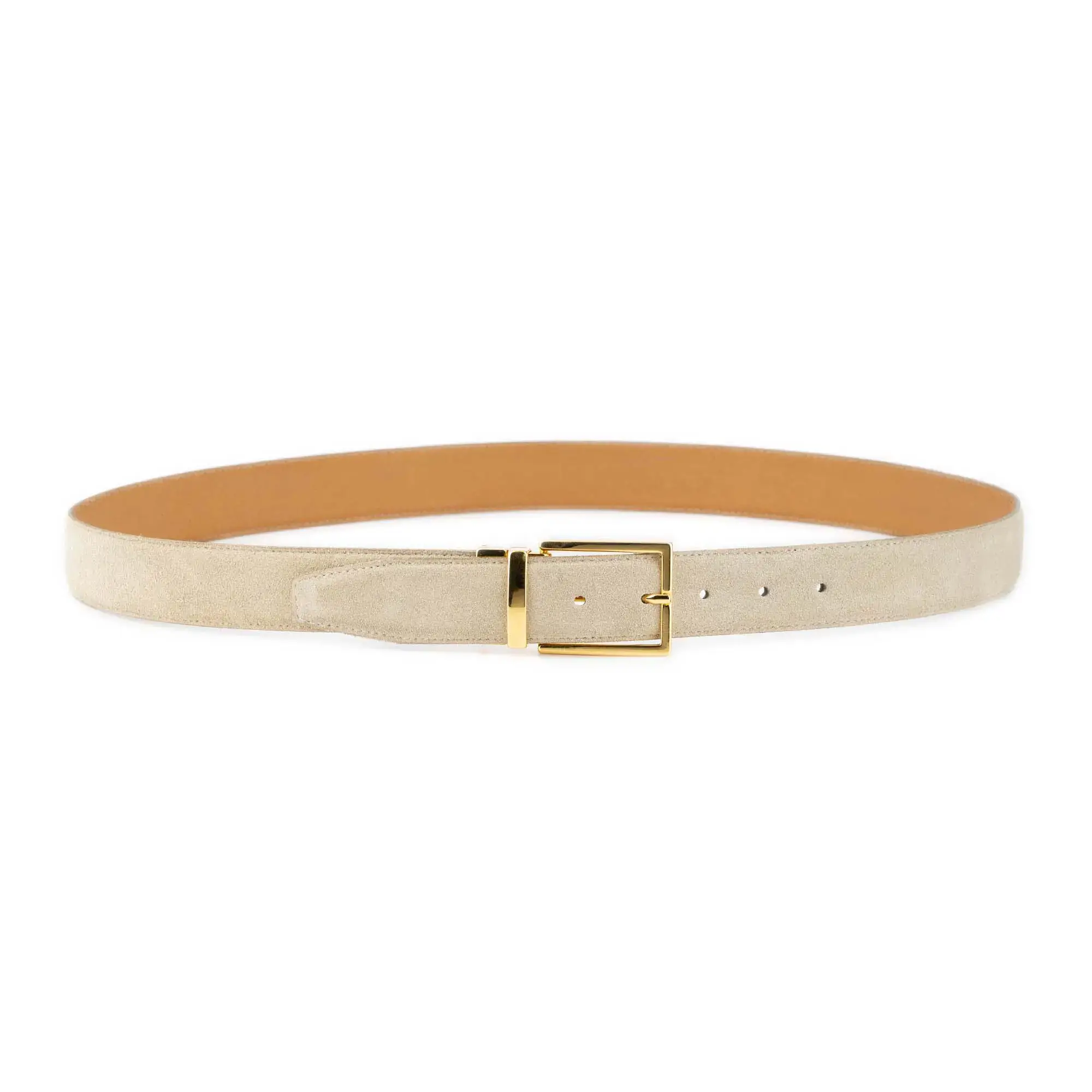 The gold buckle adds a warm, classic touch to the neutral beige strap. Strong construction ensures durability, while the suede texture brings depth and character to your outfit. This belt blends quality craftsmanship with timeless style, making it a versatile choice for any wardrobe.