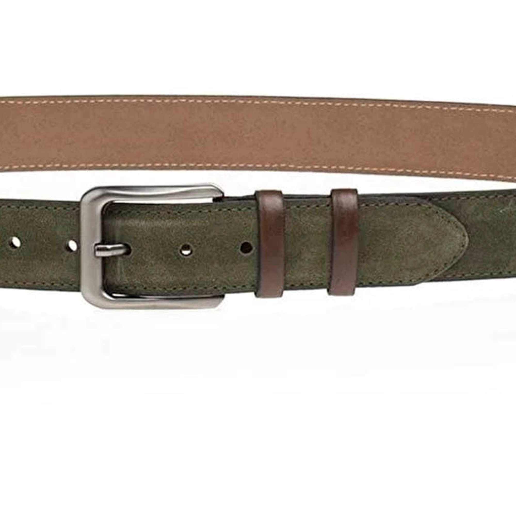Olive Green Suede Leather Belt featuring Brown Loops, exclusively available at LeatherBeltsOnline.com. Measuring a stylish 1 1/2″ (4.0 cm) in width, this belt effortlessly combines classic charm with a touch of contemporary appeal. The rich olive green color exudes confidence and style, making it a versatile accessory that adds a unique pop of color to your wardrobe. Crafted from high-quality genuine leather, this belt showcases impeccable craftsmanship, ensuring both durability and a comfortable fit around your waist. The silver-colored buckle harmonizes with the belt, adding a touch of refinement to this essential accessory. The standout feature of this belt is the brown loops that create a striking contrast against the vibrant olive green suede. This belt reflects our commitment to delivering a high-quality product designed to enhance your style.
