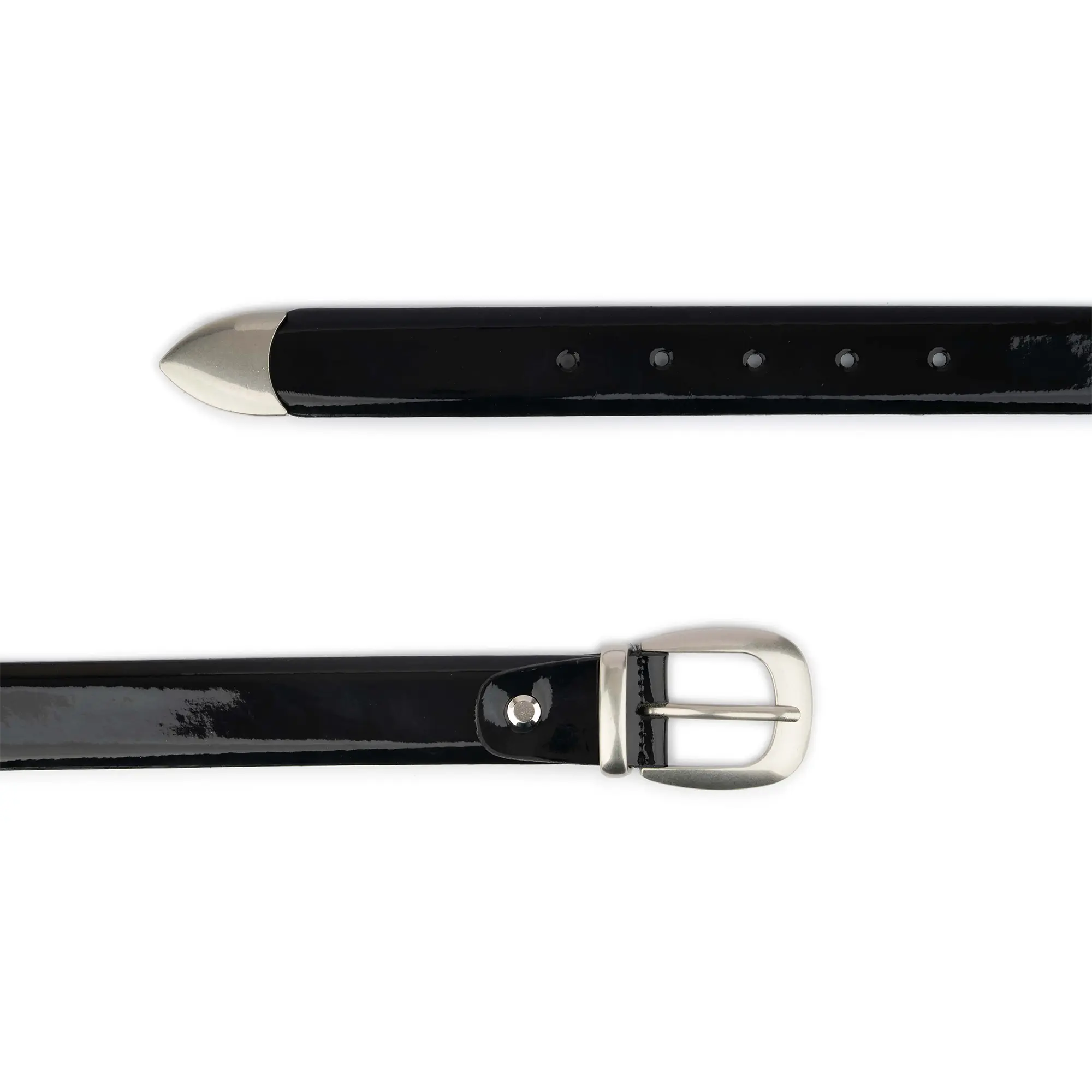 – 1 1/8″ | 3.0 cm wide – Black color belt – Genuine patent leather – Silver color buckle – Model code WB107-171025
