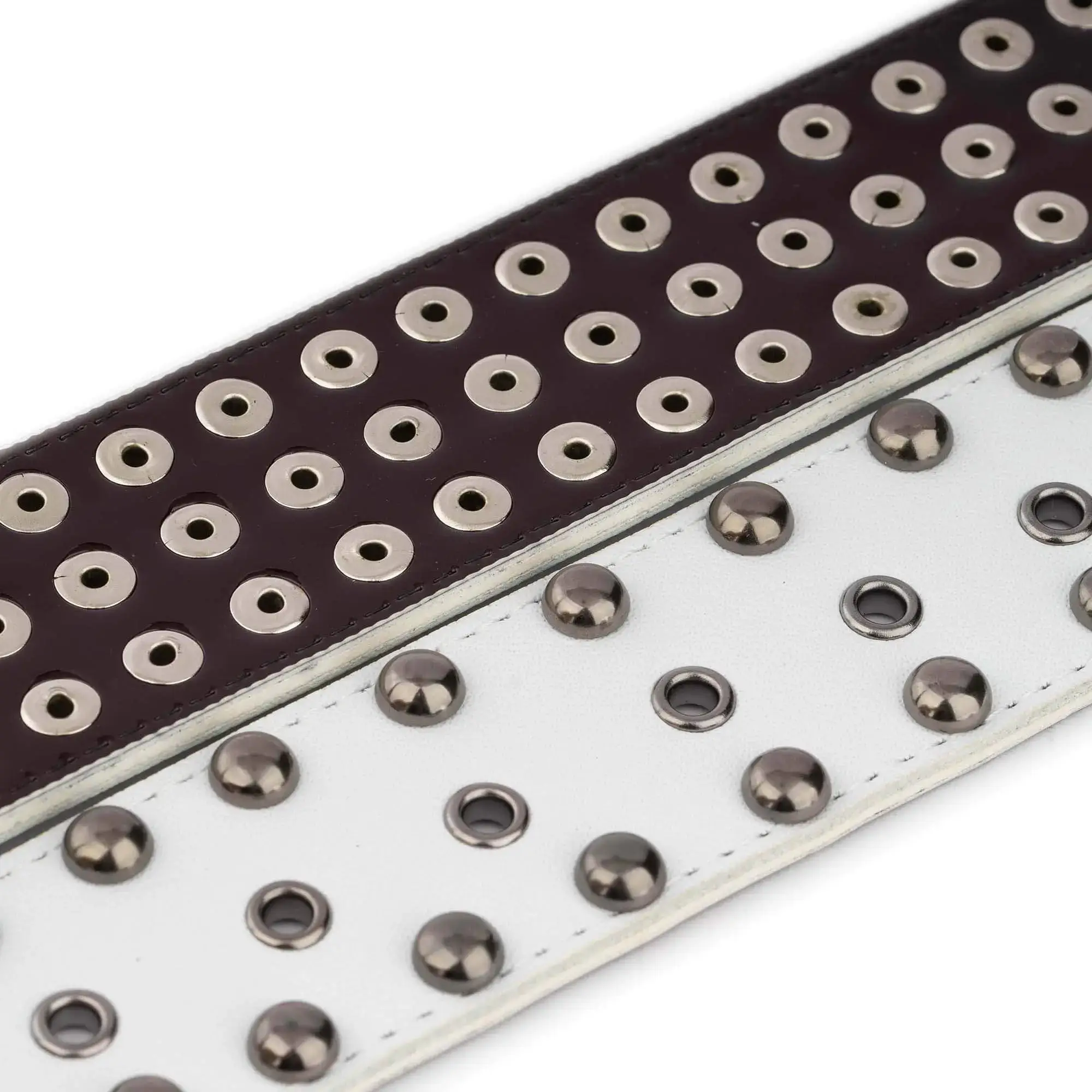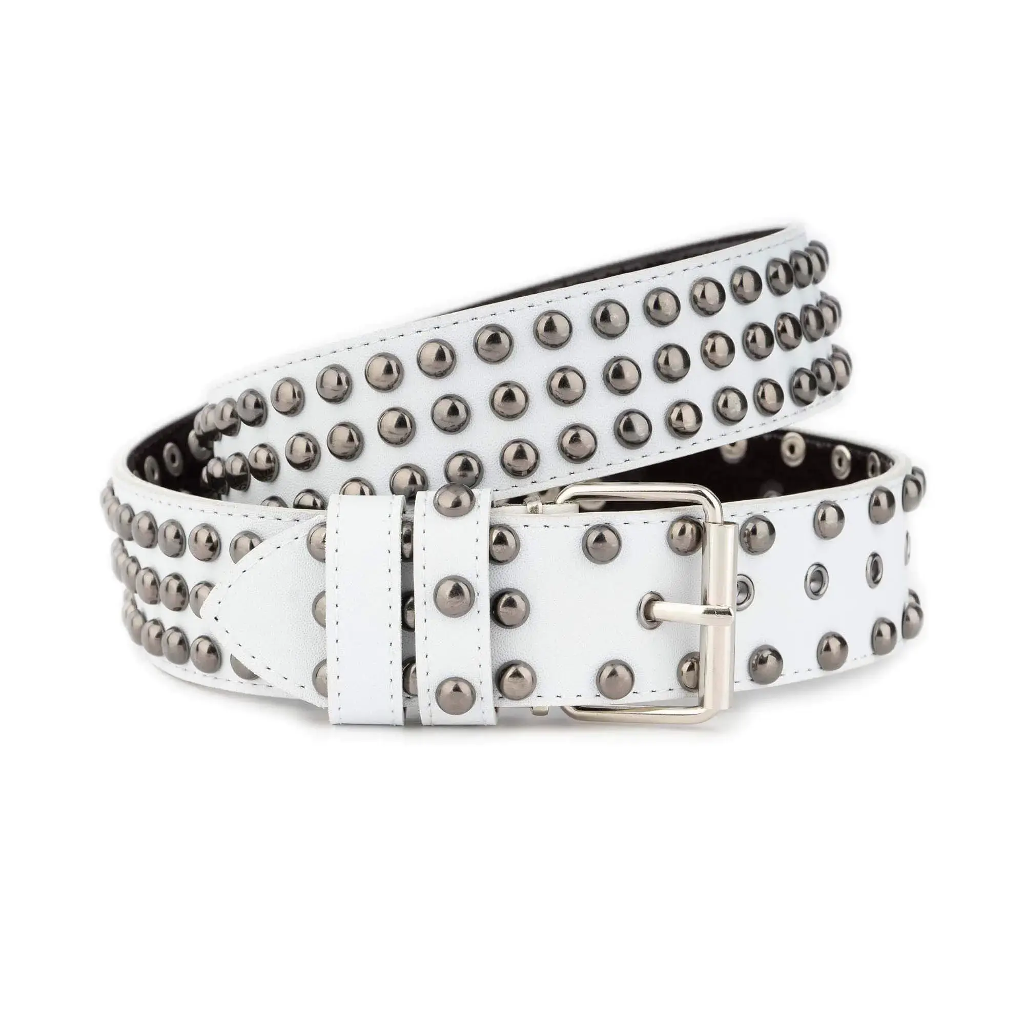 Buy White Studded Belt Rounded Head Gunmetal Rivets at LeatherBeltsOnline.com – 1 3/4″ (4.5 cm) wide – White color – Silver color buckle – Genuine leather – Model code STUD-45-WHITE-GUNROU-TARG