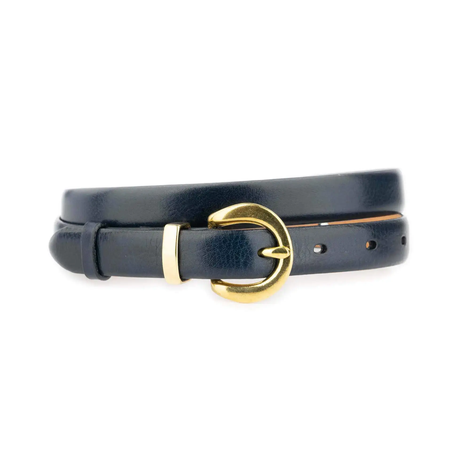 Buy Womens Navy Blue Belt With Round Gold Brass Buckle at LeatherBeltsOnline.com – 3/4″ (2.0 cm) wide – Navy Blue color – Gold color buckle – Genuine leather – Model code 31102024-20-AML-DBLUGDBRASS
