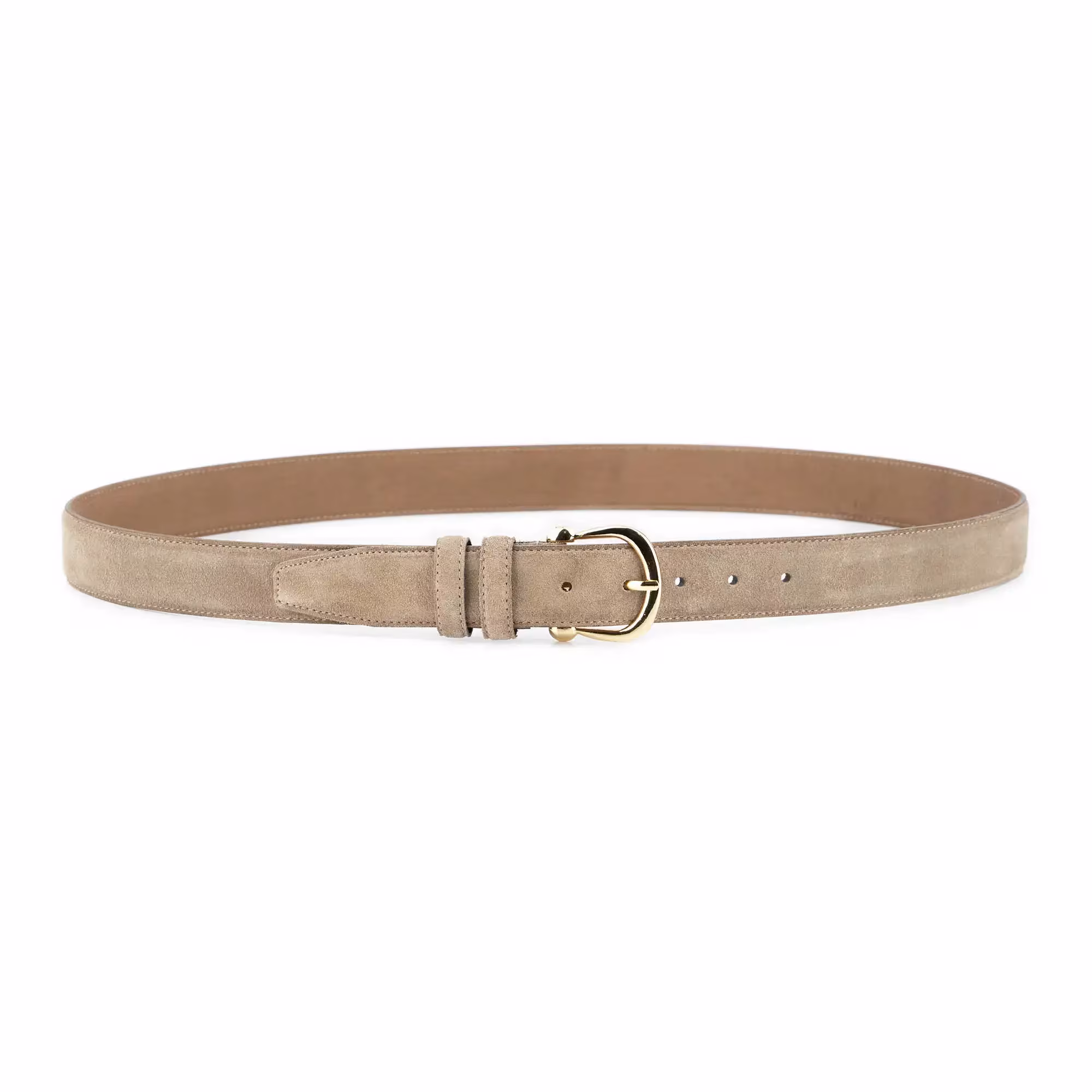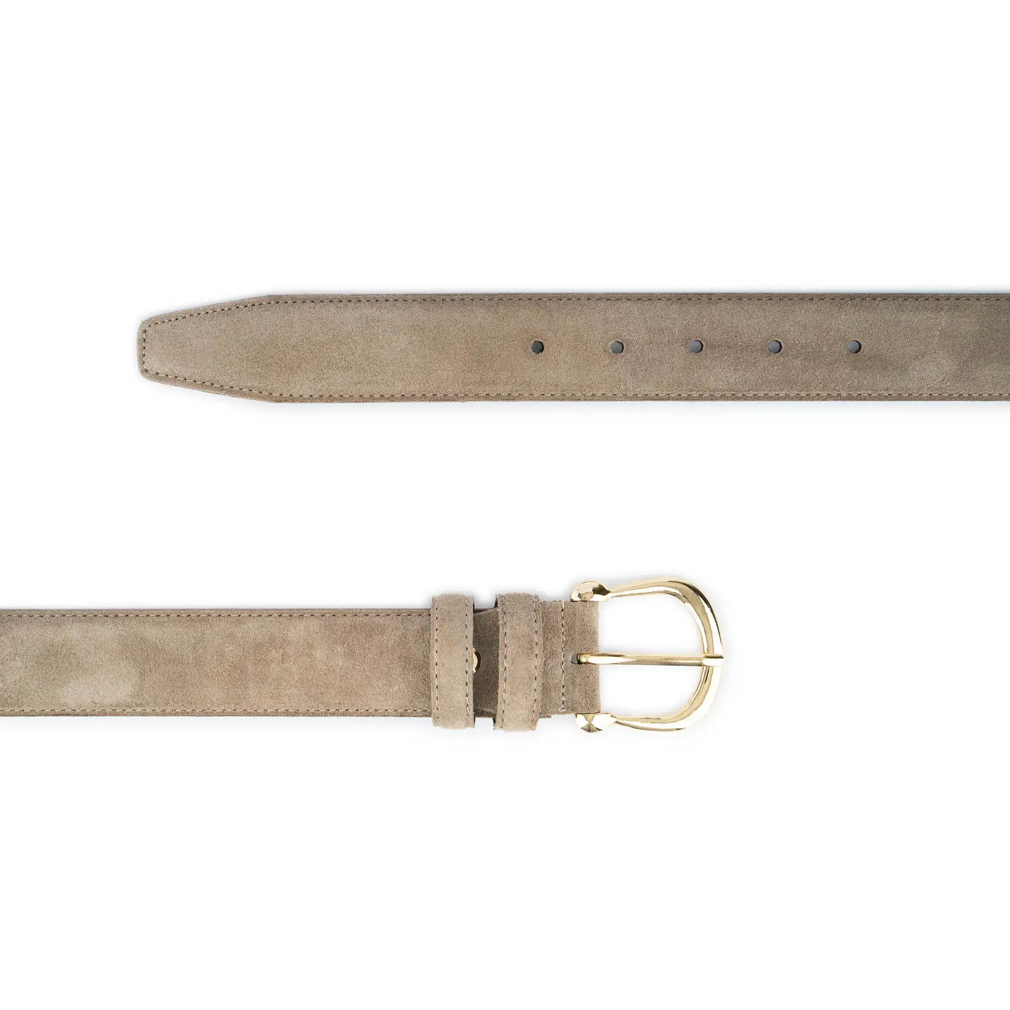 Buy Womens Taupe Suede Belt With Gold Horse Bit Buckle at LeatherBeltsOnline.com – 1 3/8″ (3.5 cm) wide – Taupe color – Premium suede leather – Gold color buckle – Gold Horse Bit Buckle – Model code SUETTAUP-35-GOLDHORSBI-KASV
