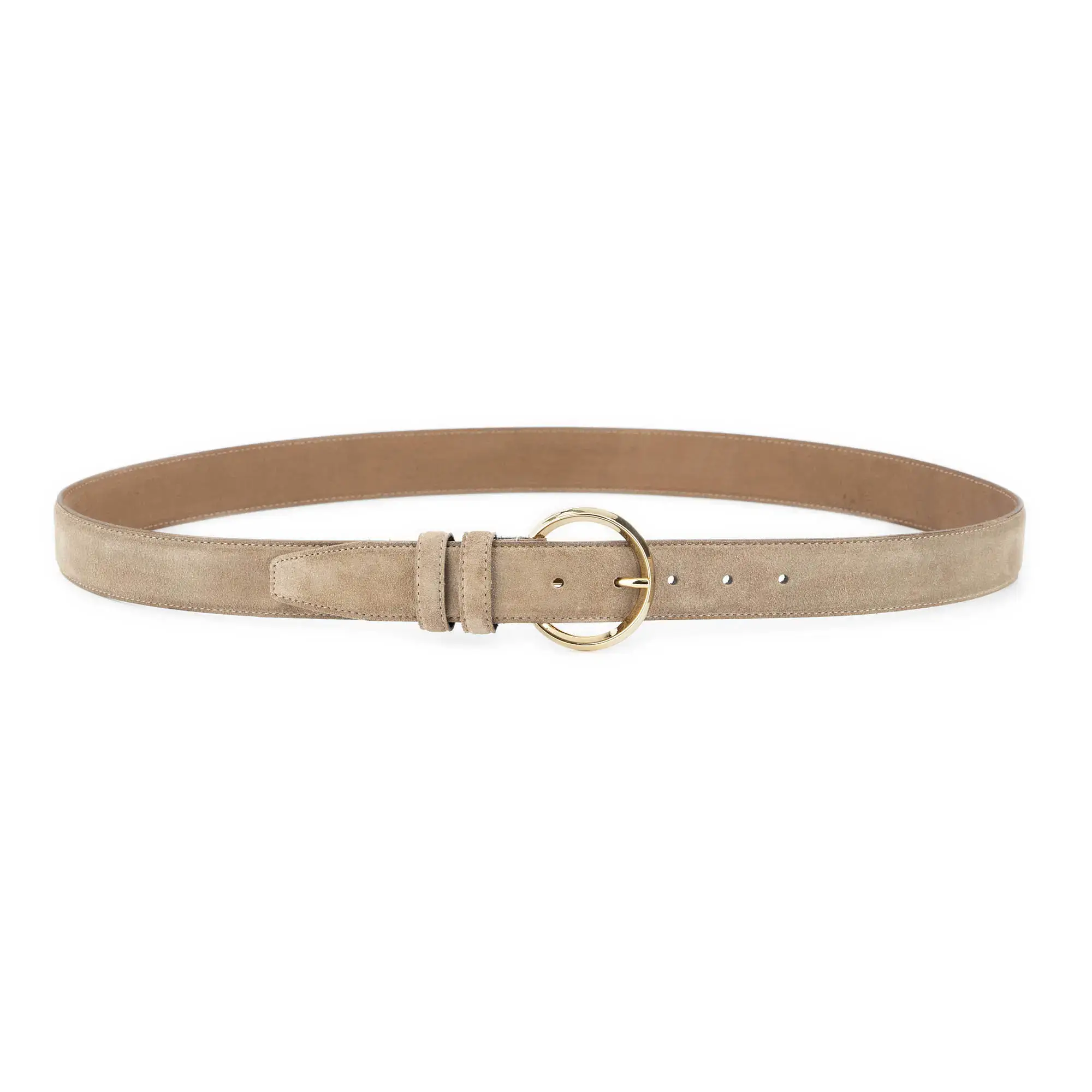 Buy Womens Taupe Suede Belt With Gold Round Buckle at LeatherBeltsOnline.com – 1 3/8″ (3.5 cm) wide – Taupe color – Premium suede leather – Gold color buckle – Gold Round Buckle – Model code SUETTAUP-35-GOLDROUN-KASV